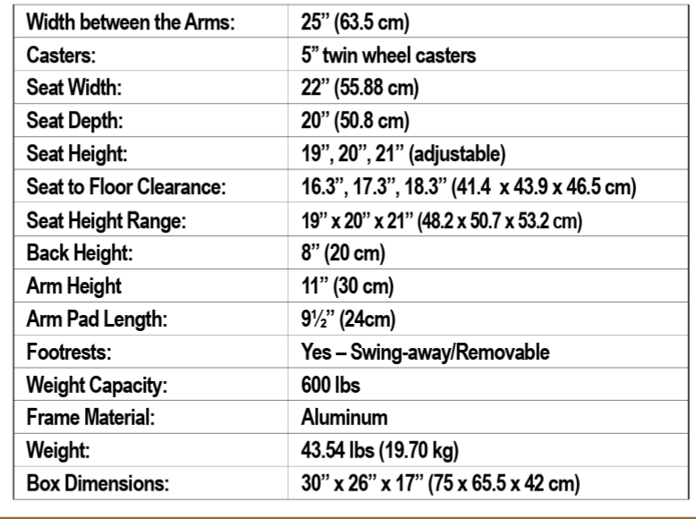 - Strong tubular aluminum frame: Heavy-duty reinforced lightweight aluminum chair designed for bariatric clients